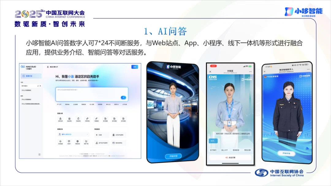 在大会备受瞩目的“第四届数字人精品秀”发布环节,小哆智能凭借卓越的技术创新与深厚的行业应用积累,成功入选并发布入展作品! 这一权威荣誉由中国互联网协会颁发,标志着小哆智能在数字人形象、智能交互及应用深度上,获得了业界的高度认可!
